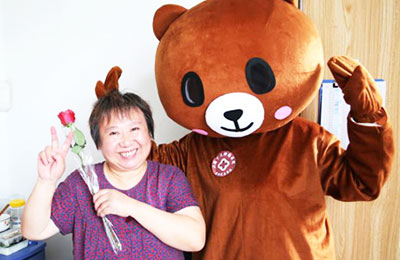 这次活动的对象是针对七夕节当天来院和住院的女性朋友,送玫瑰活动整个流程持续了一个多小时,参与者都是用手中的玫瑰表示对患者的祝福,尤其是穿着布朗熊人偶的小熊,在三十多度的高温下,依然坚持身穿厚重的人偶服装,为每一位女性患者送上个节日的祝福:上海中大肿瘤医院全体人员祝大家节日快乐。