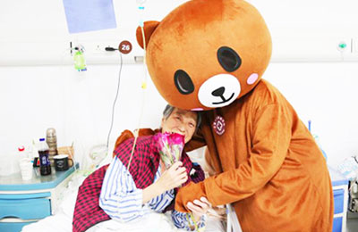 此次布朗熊的出镜,让很多躺在病床上的患者以及家属们感到非常的亲切,呆萌的表情,笨拙的走姿,手中的鲜艳玫瑰,一时间成为“院宝”。